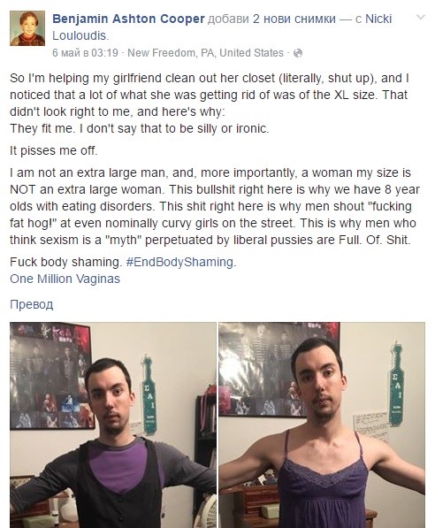 "Това наистина ме вбеси. Аз не съм едър и още по-важното е, че жена с моя размер не е едра и не е размер XL. Точно тези глупости са причината да има толкова много момиченца на по 8 години с хранителни заболявания. Ето затова някои мъже наричат жените "прасета", дори и да са съвсем леко закръглени. Затова мъжете, които си мислят, че сексизмът е мит, насаждан от либерлни п***и, са глупаци. Да вървят по дяволите стандартите за тялото", пише във "Facebook" Бенджамин.