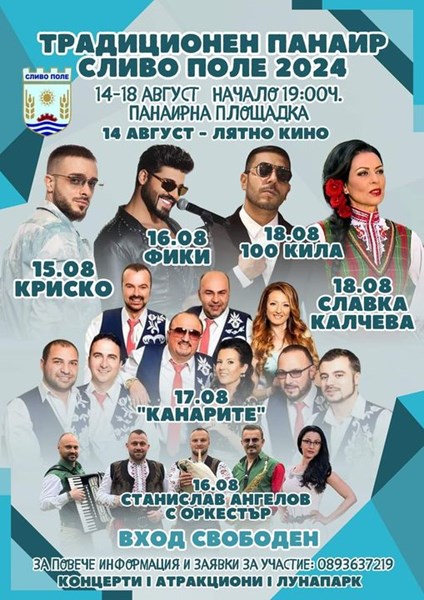 Град Сливо поле се подготвя за поредното издание на традиционния си панаир, който ще се проведе от 14 до 18 август 2024 година. Събитието ще бъде на панаирната площадка и ще започва всяка вечер от 19:00 часа. Входът е свободен за всички посетители, което обещава голямо участие и високо настроение.