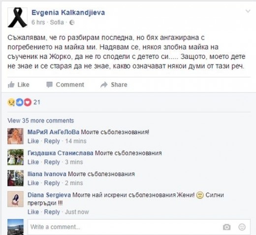 Калканджиева е преминала тихо-мълком през този тежък за нея момент. Ето какво написа тя в социалната мрежа:"Съжалявам, че го разбирам последна, но бях ангажирана с погребението на майка ми. Надявам се, някоя злобна майка на съученик на Жорко, да не го сподели с детето си..... Защото, моето дете не знае и се старая да не знае, какво означават някои думи от тази реч."