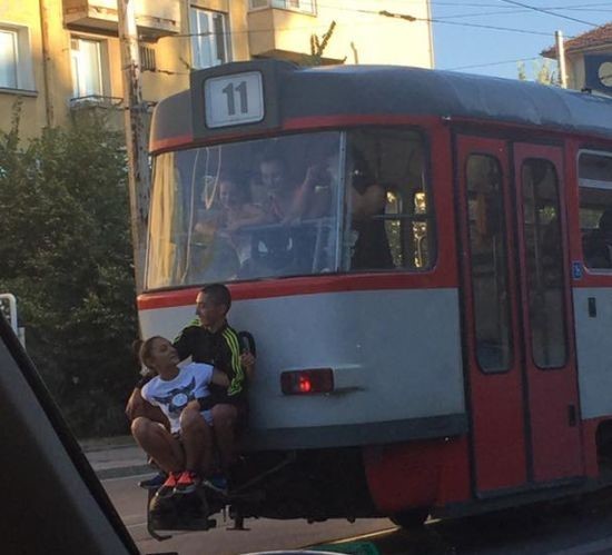 Двама тийнейджъри изпробваха нетипичен метод за придвижване с градски транспорт из софийските улици, показва БЛИЦ.