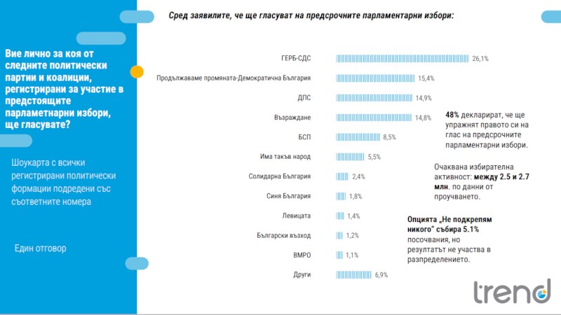 "Тренд": ГЕРБ "отлепва" с 10%, три партии се борят за второто място