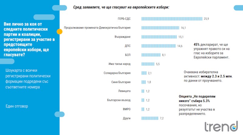Няма сериозна разлика в предпочитанията на българите между изборите за национален и европейски парламент. Очаква се малко по-силен резултат на европейските избори за коалицията ПП-ДБ (16.1%) и Възраждане (15.1%). За БСП резултатът за евролистата ще бъде по-слаб в сравнение с националния вот.
