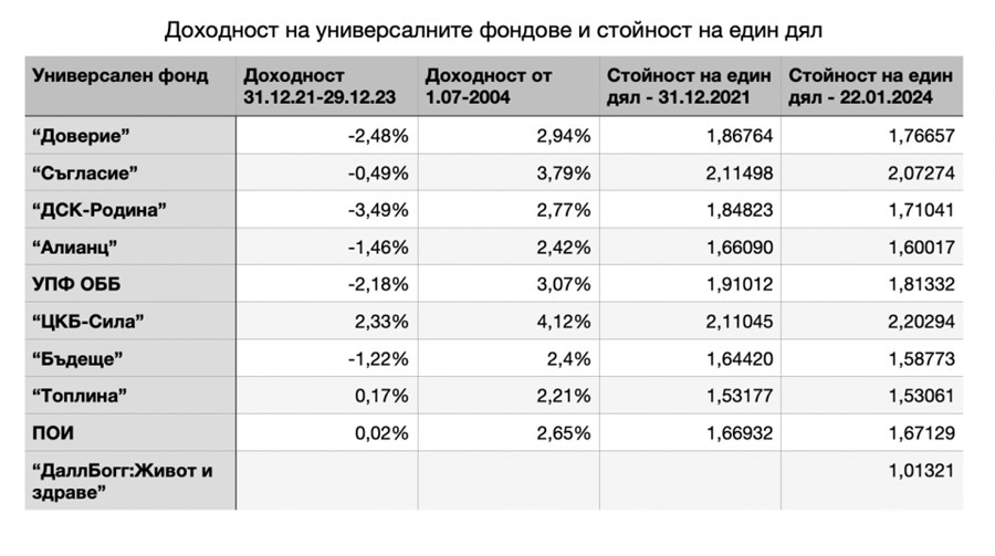 С положителна доходност за 2021-2023 са три по-малки фонда - "ЦКБ-Сила", "Топлина" и ПОИ. Най-висока доходност отчита "ЦКБ-Сила" - 2,33%. При големите резултатите сега са двойно по-високи в сравнение със статистиката към края на септември. "Доверие", който е най-големият универсален фонд у нас, отчита минус 2,48% за последните 2 години. "Съгласие" постига минус 0,49%, "Алианц България" е с минус 1,46%, а "УПФ ОББ" има минус 2,18%. С най-ниска доходност е "ДСК-Родина" - минус 3,49%. За сравнение, отчетените към септември данни стигаха до минус 4-5,50%.