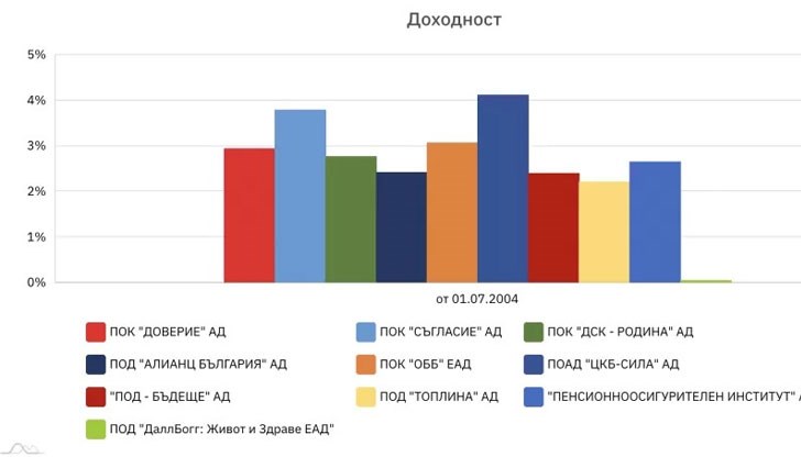 Най-големият фонд "Доверие" е с 2,94% за целия период, "Съгласие" е с 3,79%, "ДСК-Родина" има 2,77%, "Алианц" - 2,42%, ОББ - 3,07%, "ЦКБ-Сила" - 4,12%, "Бъдеще" - 2,4%, "Топлина" - 2,21%, ПОИ - 2,65%.