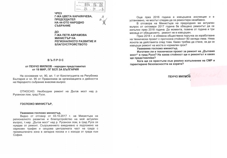 Не съм удовлетворен от Вашия отговор, това заяви Пенчо Милков, в реплика на Министъра на регионалното развитие и благоустройството касаещ необходимостта от спешен ремонт на Дъговия мост в Русе, след като през октомври 2017 година, г-н Милков е питал за същото. Народният представител разясни, че предходната процедура е от март 2018 и вече три години само се констатира необходимост от ремонт на моста и то спешен ремонт. „Това е мост, не е път!”, подчерта г-н Милков и попита повторно г-жа Аврамова: „Гарантирате ли безопасността на пътуващите по него, при положение, че 2016 ведомството се е произнесло за спешен ремонт?”