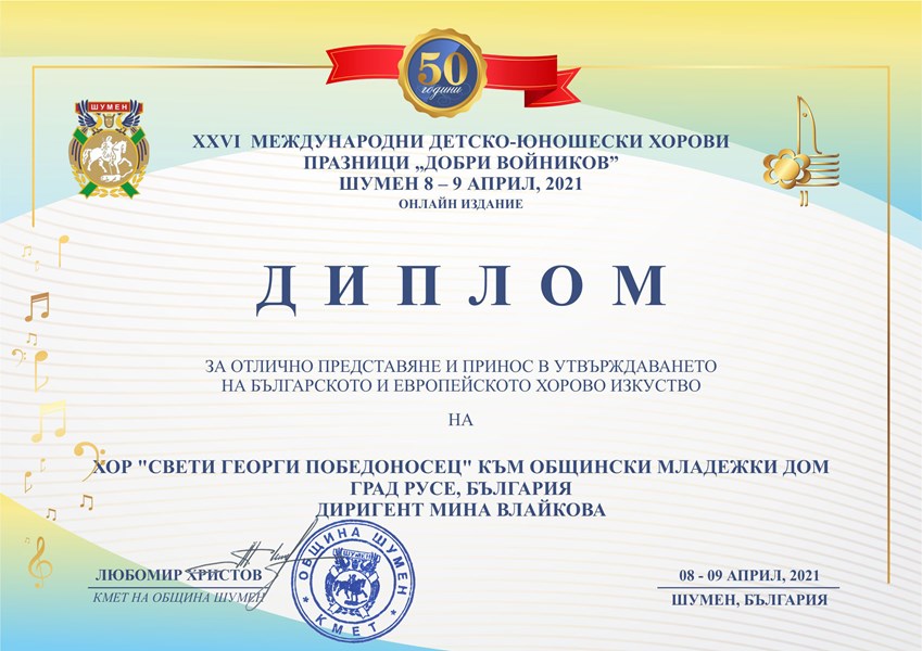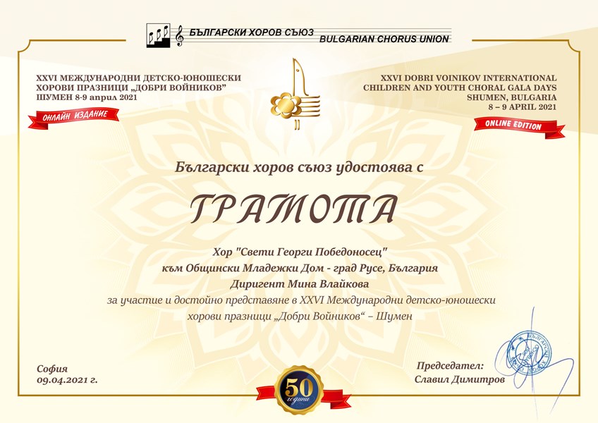 Хор “Свети Георги Победоносец” при Общински младежки дом - Русе бе отличен с три награди в 26-ото юбилейно издание на Международните детско-юношески хорови празници „Добри Войников“ 2021 г. в Шумен.