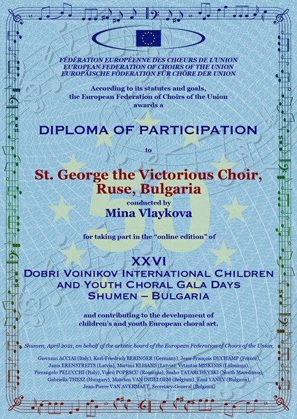 - Диплом за участие и принос в развитието на детското и младежко Европейско хорово изкуство от Европейската Хорова Федерация с генерален секретар Жан-Пиер ван Авермает.