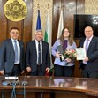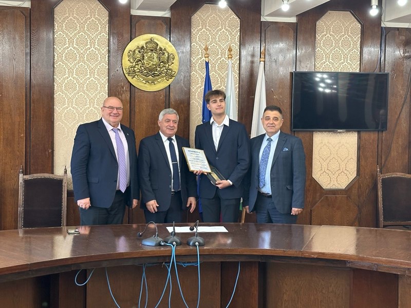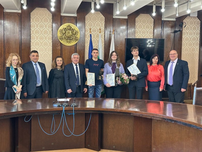 Дванайсетокласниците Ренета Маринова, Преслав Ламбев и Викторио Илиев получиха грамота и плакет от ВрИД кмета на Община Русе Димитър Недев, председателя на Постоянната комисия по образование, наука и иновации (ПКОНИ) при Общински Съвет – Русе акад. Христо Белоев дтн и зам.-кмета Енчо Енчев.