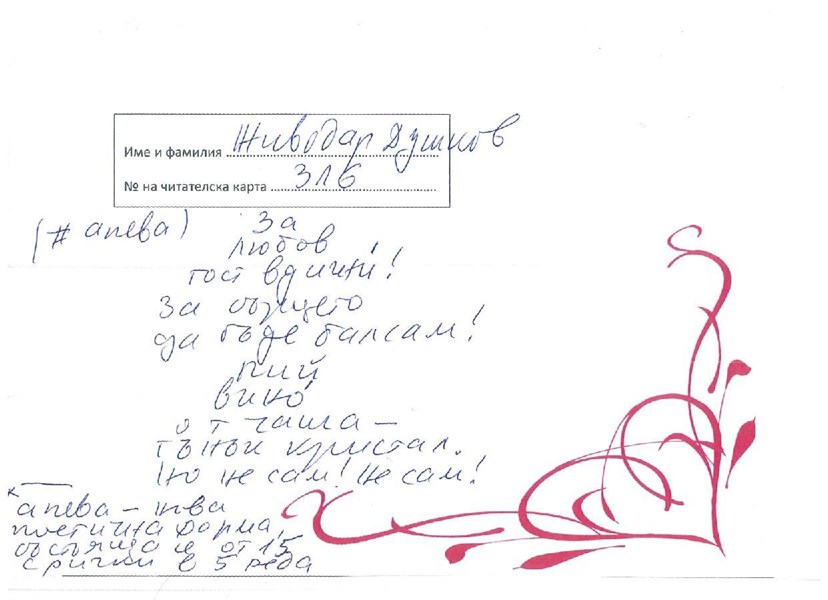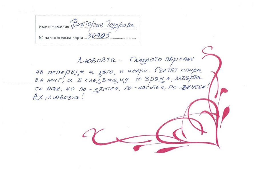 Своето послание, стихче, мисъл, пожелание за най-великото чувство и най-вълшебното питие написаха 14 читатели и гости на библиотеката!