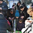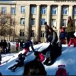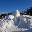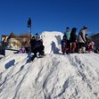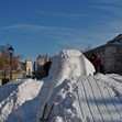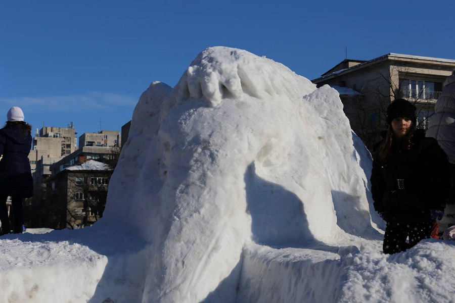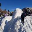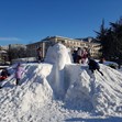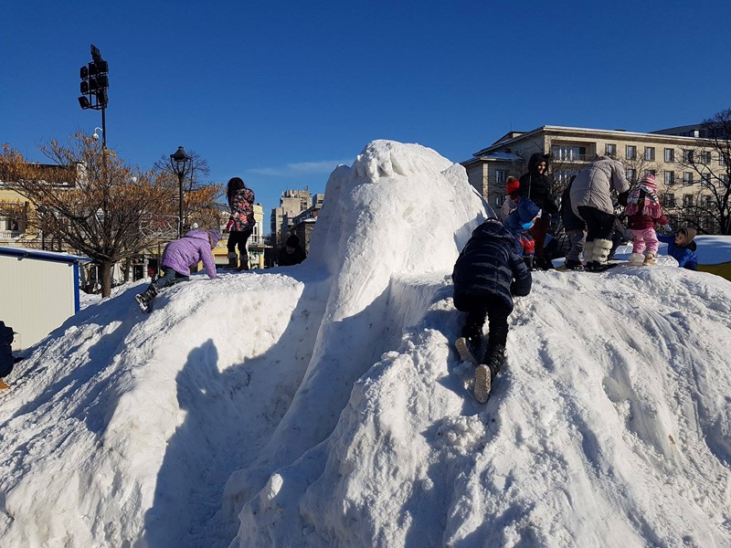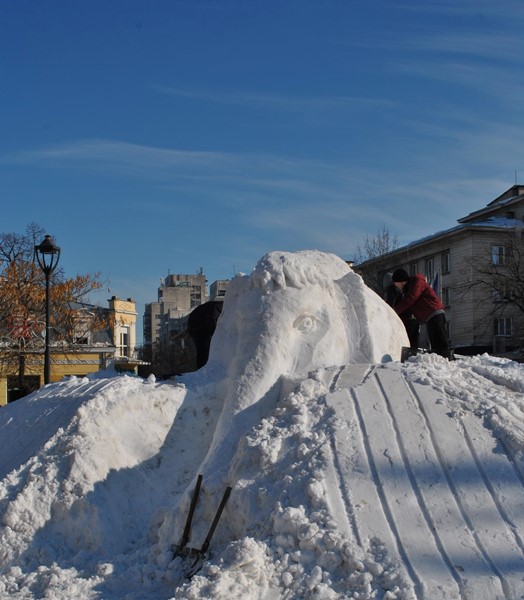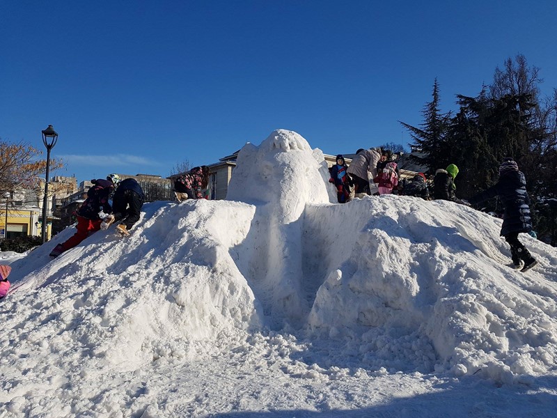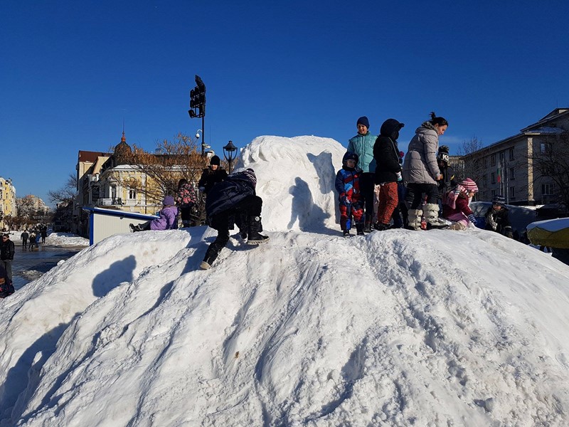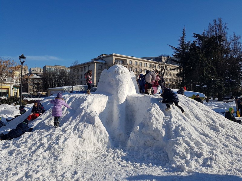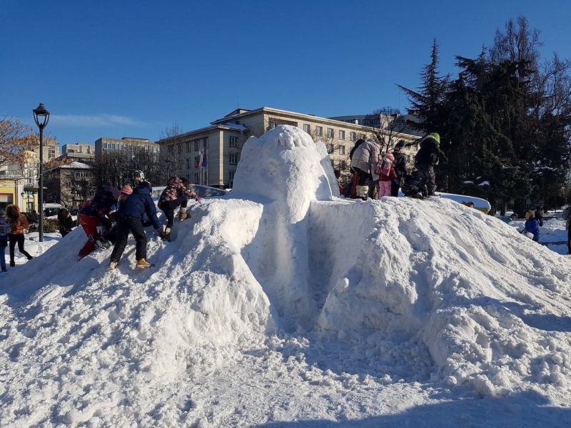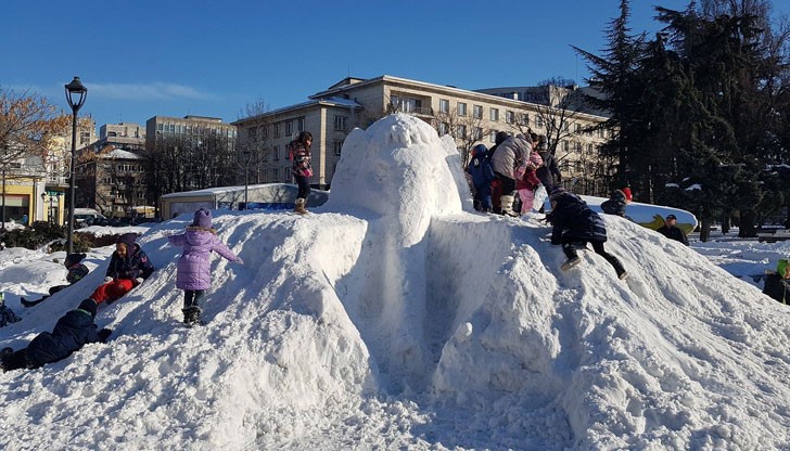 Бивните на Мани се превърнаха в пързалка за най-малките, които използваха слънчевото време днес, за да се забавляват със снежния мамут