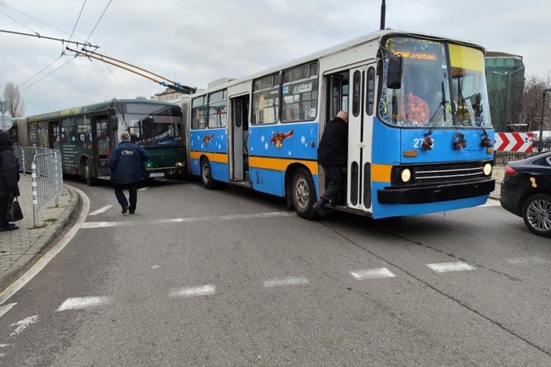 Там е имало удар между коледния тролейбус и автобус по линия 213, съобщиха във фейсбук групата "Безумията в София". За щастие сблъсъкът е лек и няма пострадали хора. Щетите са само материални.