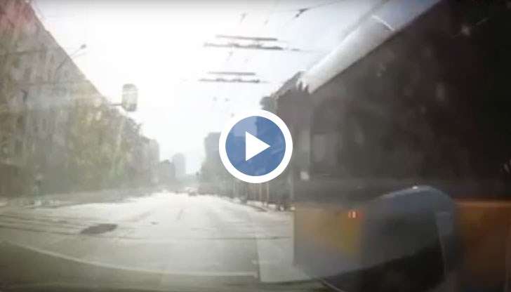 Тролеят минава необезпокоявано 11 секунди, след като светофарът е светнал в червено