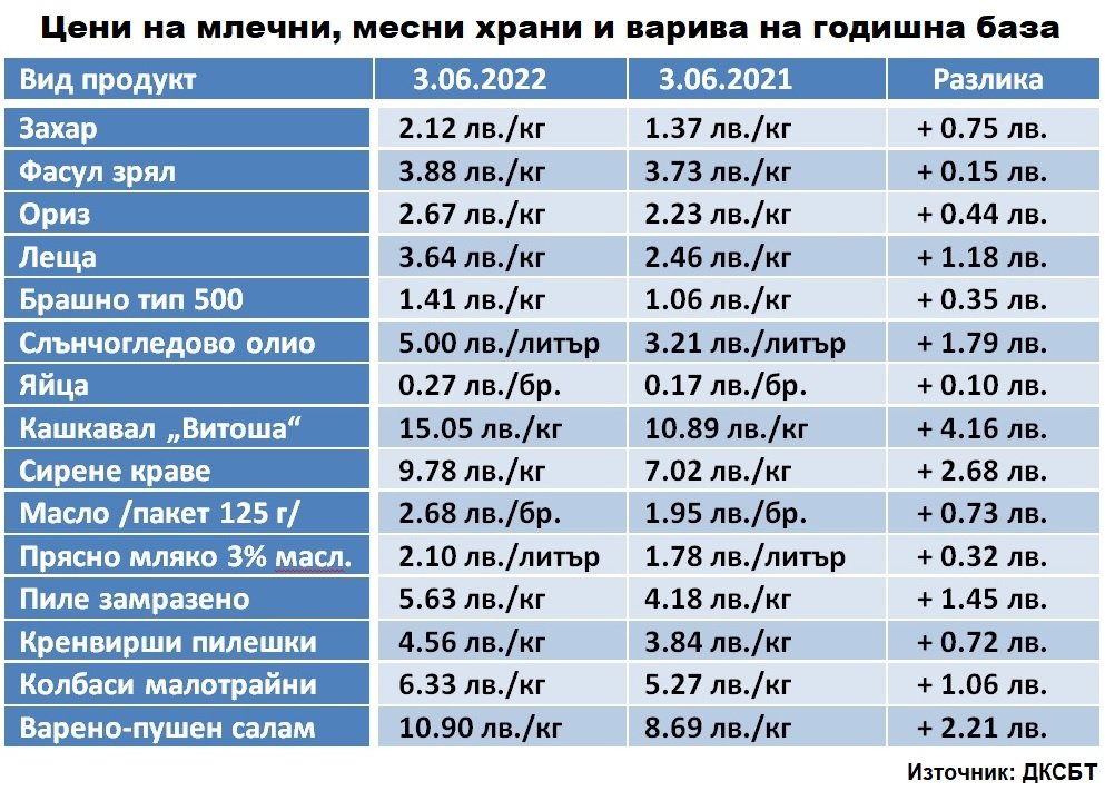 От таблицата по-горе е видно, че на годишна база всички млечни, месни и други храни, вкл. и варивата са поскъпнали, а с над 1 лев са се повишили цените на 6 от общо 20 продукти, като най-голяма е разликата при кашкавала "Витоша" (+4.16 лева) и при кравето сирене (+2.68 лева).