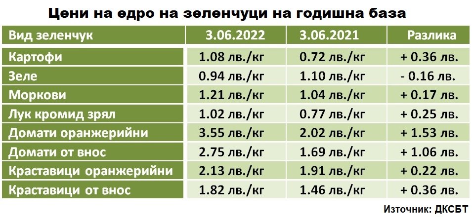 От таблицата по горе е видно, че на годишна база са поскъпнали всички зеленчуци, с изключение на зелето, а с над 1 лев са се повишили цените на оранжерийните домати и доматите от внос.