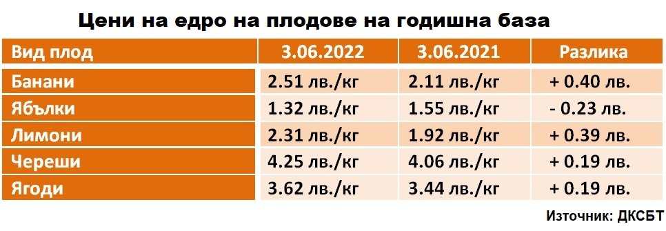 Най-много са поевтинели черешите (-32.4% до 4.25 лв./кг), следвани от ябълките (-5.0% до 1.32 лв./кг) и бананите (-1.2% до 2.51 лв./кг). Поскъпнали са само лимоните (+10.0% до 2.31 лв./кг).