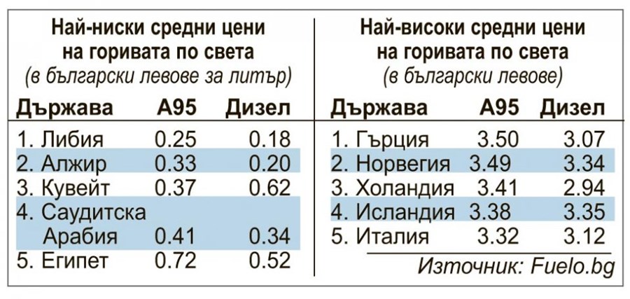В момента А 95 в България струва средно 2.29 лева, а дизелът върви по 2.41 лв. за литър, което е колкото плащат в Словакия и е по-скъпо от Полша. Но различията в отделните региони на страната са доста сериозни. Ако в някои бензиностанции по морето бензинът може да се намери и по 2.14 лв. за литър, в София и по магистралите той достига 2.47 лева за литър. Подобна е и ситуацията при дизела, чиято цена се движи от 2.21 лв. до 2.46 лв. за литър на някои бензиностанции. И докато преди месеци за цените на горивата важеше правилото, че колкото по-далеч зареждаш от София, толкова по-евтино излиза, то сега това не е така. София е в средата на класацията по скъпотия. В столицата бензинът се търгува средно по 2.35 лева за литър, а дизелът - по 2.38 лева.
