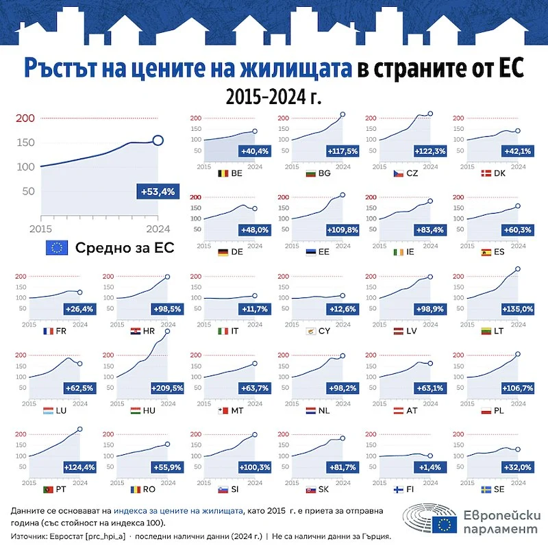 Покупката на първо жилище изглежда все по-немислима за голяма част от работещите, тъй като доходите изостават сериозно от инфлацията на имотния пазар. За по-малко от десетилетие цените на жилищата в Европейския съюз са нараснали средно с 53 процента. България се нарежда сред страните с най-голям ценови шок със своите 117.5 процента увеличение, отстъпвайки само на Унгария, Литва и Португалия.
