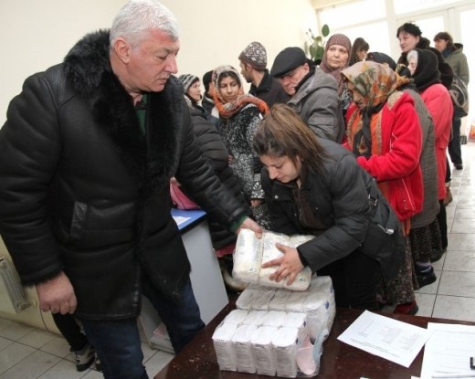 Първа сред чакащите бе 26-годишната Есения Юриева. Оставила у дома синовете си по на 3 и 1 година, но взела бебешката количка - да пренесе с нея тежкия товар от 10 пакета брашно, 6 пакета ориз, 7 пакета макарони, 5 пакета картофено пюре, 3 консерви гювеч, 2 кутии компот, 2 опаковки конфитюр, 6 кутии месна консерва, 8 пакета захар и 4 кутии вафли. Жената ги пренесе сама на три курса до вратата и после оттам до количката. Преди да я забута в преспите към къщи, обясни, че мъжът я оставил, а и преди това не носел пари вкъщи.
