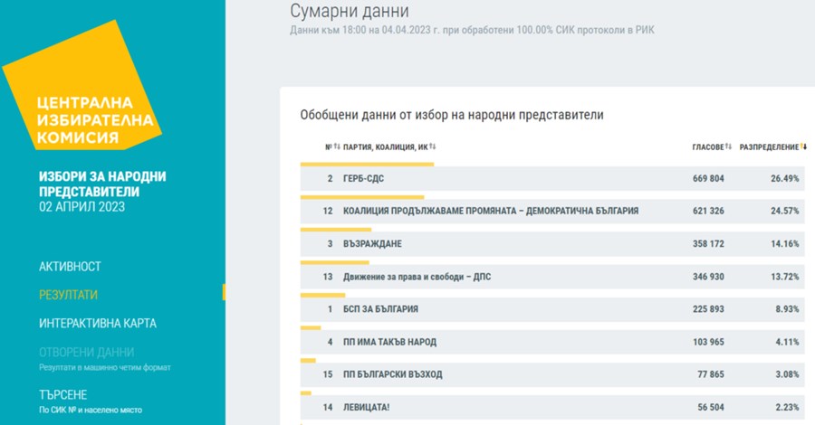 Централната избирателна комисия (ЦИК) промени данните при 100% обработени протоколи от секционните избирателни комисии в районните избирателни комисии в страната, сочи справка на сайта на ЦИК. Новите и последни данни са към 18:00 часа на 4 април.