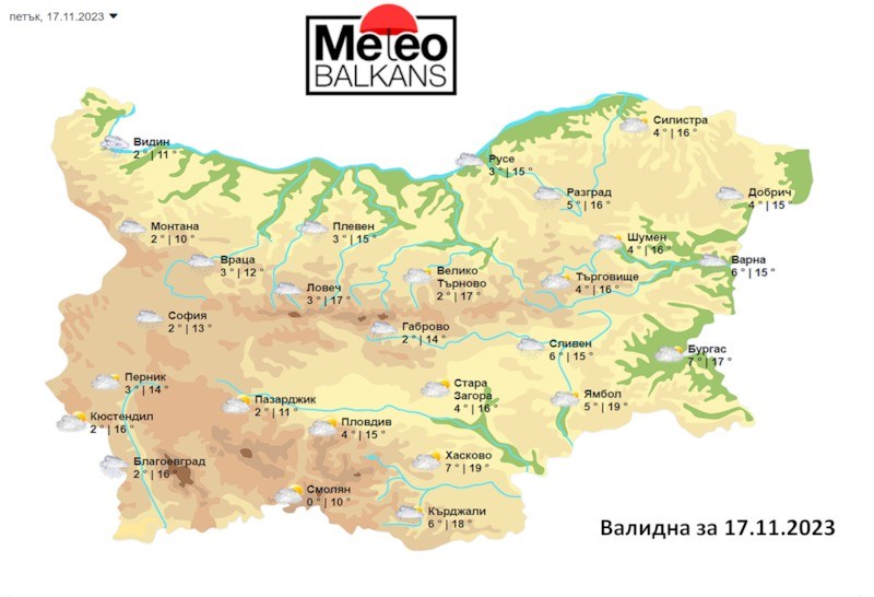 Около след обяд в петък, под влияние на приближаващ циклон, от запад на изток облачността ще се увеличава и в Западна и Северозападна България ще започнат валежи от дъжд. Ще има условия и за гръмотевични бури над Югозападна и Югоизточна България.