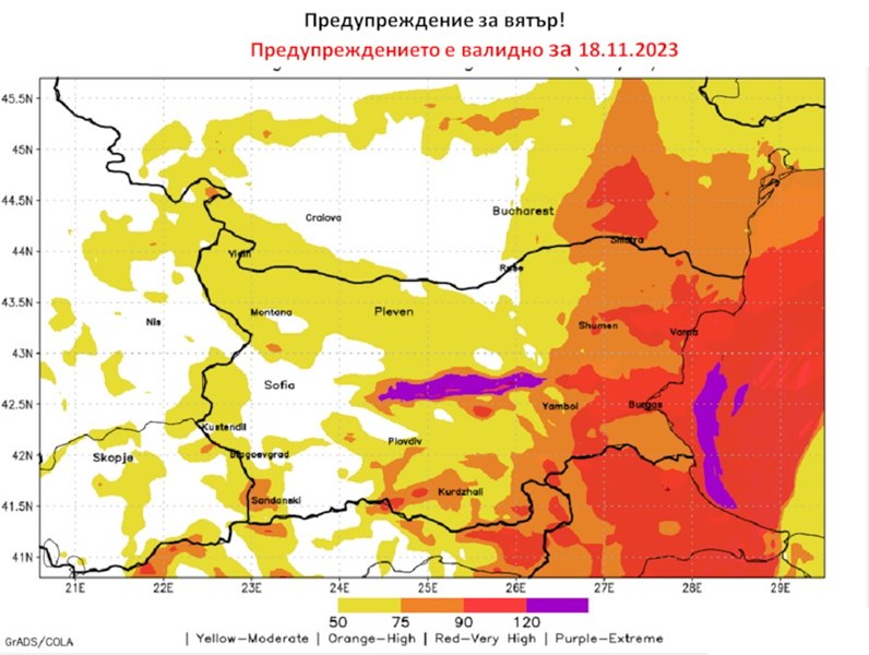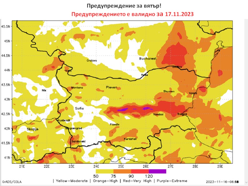 Картата, която виждате, е базирана на регионалния числен модел SPM и показва районите, където ветровете ще са най-силни.