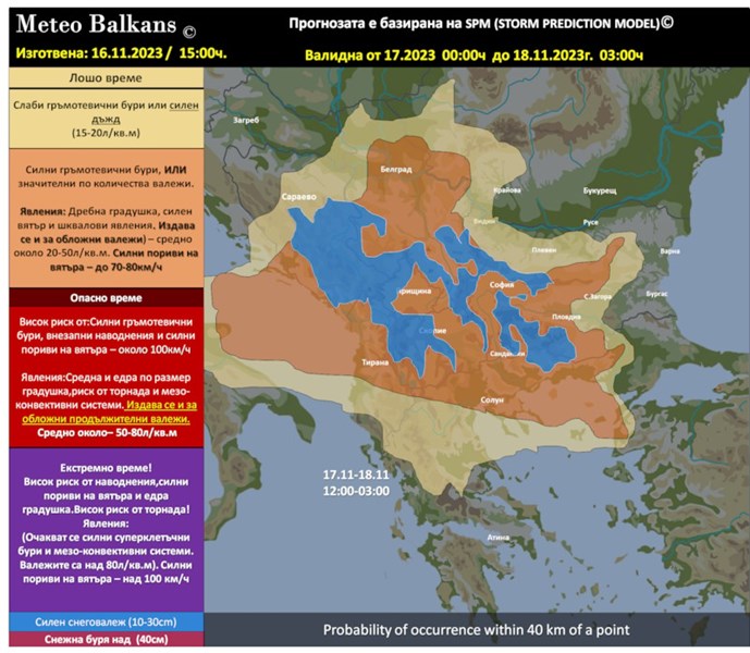 Meteo Balkans издаде карта с предупреждения за лошо време, които са валидни за петък - 17 ноември. (Забележка: Картата показва районите, в които вероятността за опасни явления е най-голяма, но НЕ винаги бурите обхващат зоните оградени на картата!!!)