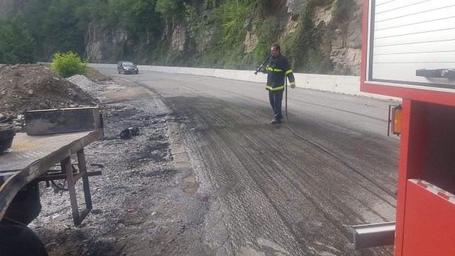 Цистерната е изгасена, пожарникарите са спасили гората от пожар, издирват бутилката с пропан бутан, която е изхвърчала в гората и ограничават разлива на битума към реката или другото платно.