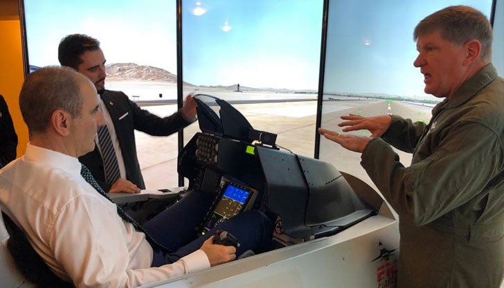 Първи в симулатора на пилотската кабина за пробен полет седна командирът на Военновъздушните сили ген. Цанко Стойков. Заедно с него бяха и курсанти от военния университет, които един ден ще летят на тези изтребители.