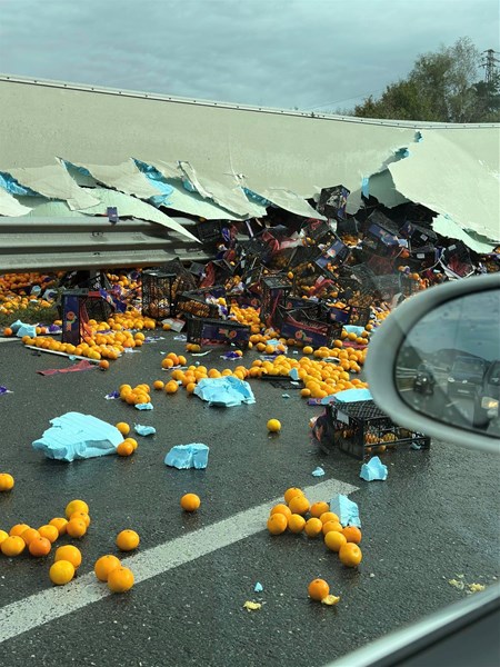Тежкотоварен автомобил с турска регистрация, превозващ портокали, се е обърнал върху разделителната мантинела на автомагистрала "Хемус". Инцидентът е станал при 35-ия километър на магистралата.