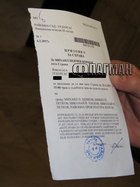 Михаил Цонков се яви в Бургаския окръжен съд, където му бе връчена призовка. Според нея на 21 март Цонков трябва да получи обвинителен акт от Тежкия наказателен съд в Къркларели. Той е призован заедно със своите двама колеги - Живко Петков и Николай Тошков, като срещу тях са повдигнати четири различни обвинения. Интересното е, че призовката е и срещу Районна прокуратура - Бургас.
