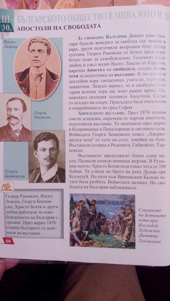 Един от цитатите в учебника гласи: "Докато едни българи будели жажда за свобода със знание и вяра, други подготвяли въоръжен бунт". Като с тези думи се визират Левски и Раковски.