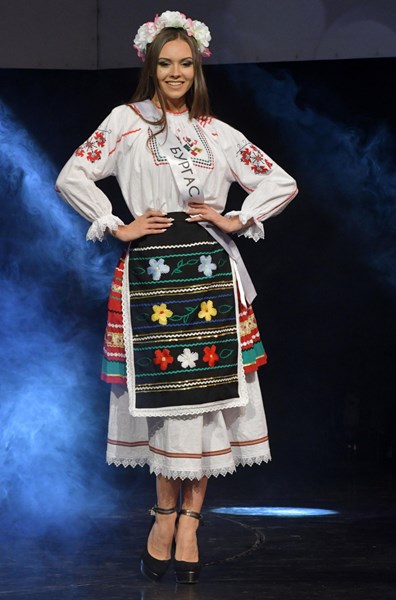 Темата на тазгодишния конкурс беше "Красотите на България", затова 18-те претендентки откриха вечерта с дефиле в народни носии. След това ги видяхме по бански и в ефирни вечерни рокли.