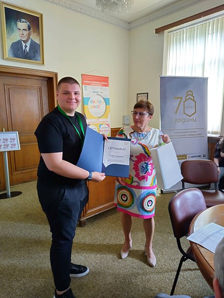 Георги Стоилов получи сертификат, с който е приет за обучение в Химикотехнологичен и металургичен университет гр. София в специалност „Дигитализации и конвенционални печатни технологии и дизайн“, след завършване на средното си образование, от проф. д-р инж. Сеня Терзиева-Желязкова – ректор на университета.