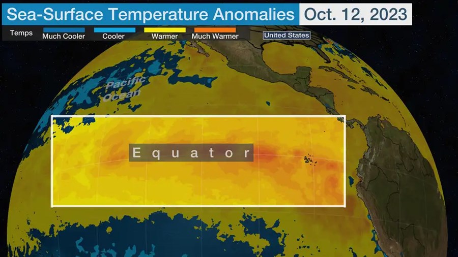 Синоптиците от Центъра за прогнозиране на климата на NOAA все още прогнозират силни прояви на Ел Ниньо късно тази есен и през зимата, с около 75-85% шанс от ноември до януари. Това означава, че средната сезонна температура на морската повърхност в определен регион на екваториалния Тихи океан ще бъде по-топло с 1,5 градуса над нормата, пише Meteo Balkans.