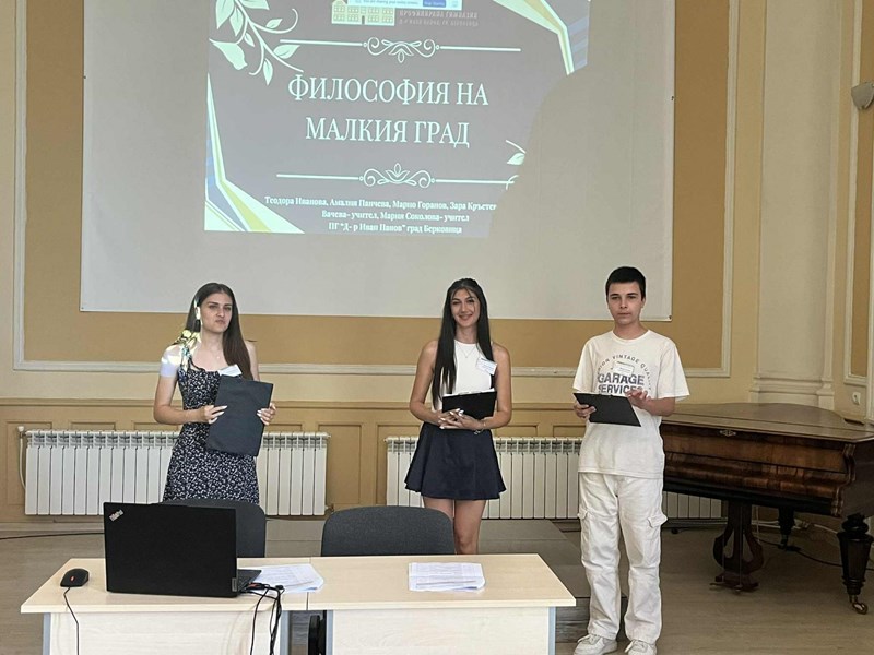 Победителската презентация в група учител-ученик беше на тема "Философията на малкия град: Берковица като литературен и екзистенциален феномен". За своята разработка те получиха грамота и престижния Знак на форума от ръцете на председателя на журито д-р Капка Иванова.