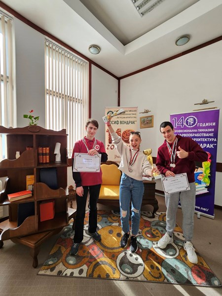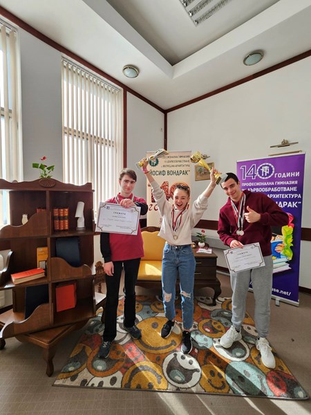 Ивана Колева, 10. клас, специалност "Художествена дърворезба", и Назиф Назифов и Красимир Митев, 12. клас, специалност "Мебелно производство", съставиха златния екип, който грабна второто място в категория "Стилни мебели" с изящния си "Кът за четене". Творбата, изработена от череша с елементи на дърворезба, съчетава оригинално изпълнение в бароков стил с модерни механизми и функционалност, отговаряща на съвременните нужди.