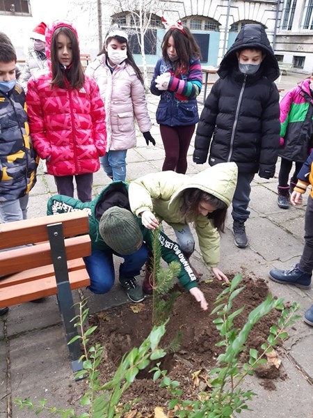 С помощта и под ръководството на своите учители те засадиха в двора пред училището бели борчета. Дръвчетата са подарък от Гората.бг, а инициативата е в подкрепа на национална кампания с мото „Тази Коледа засади дърво“.