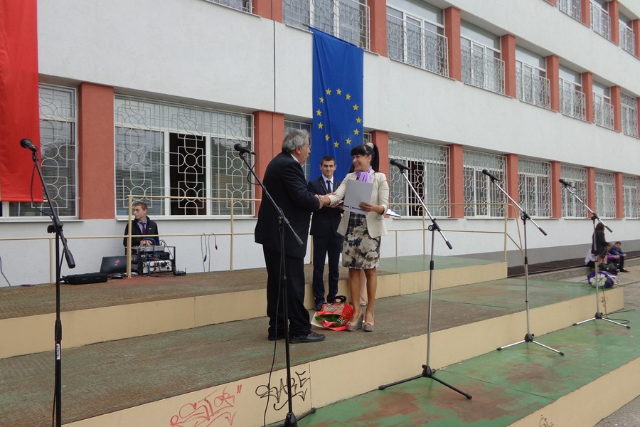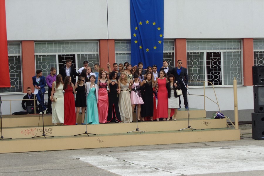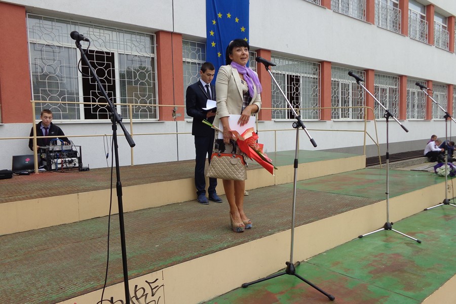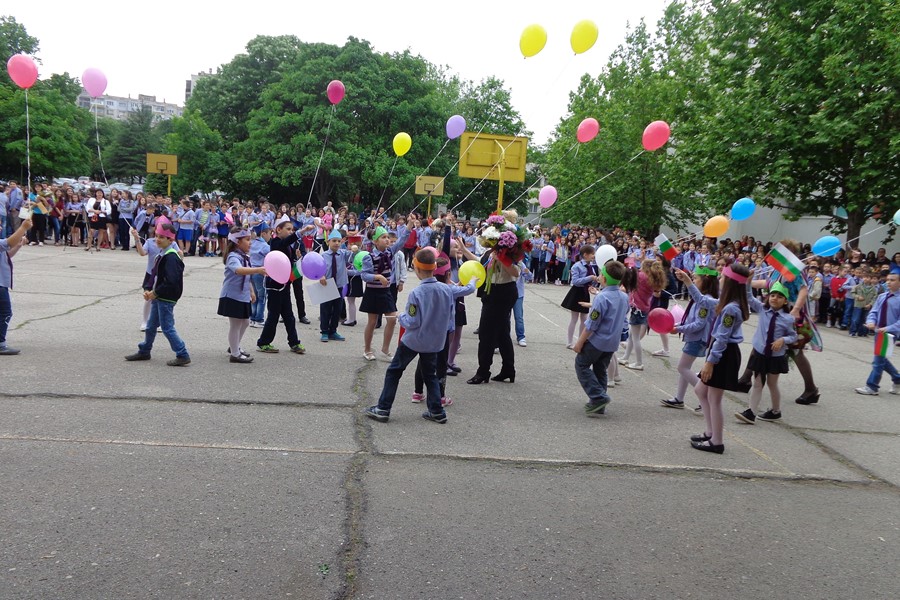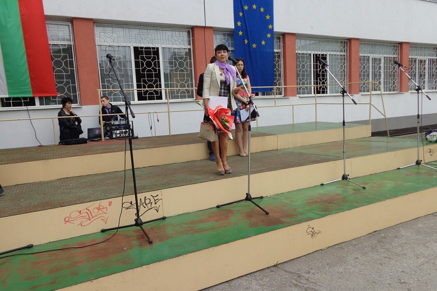 Празничната програма, посветена на 24 май, бе изпъстрена със стихове, песни, и танци. За да поздравят директора и учителите си, на тържеството дойдоха и част от абитуриентите на гимназията. Снощи те са отпразнували своя първи бал и се качиха на празничната сцена с официалните си тоалети.