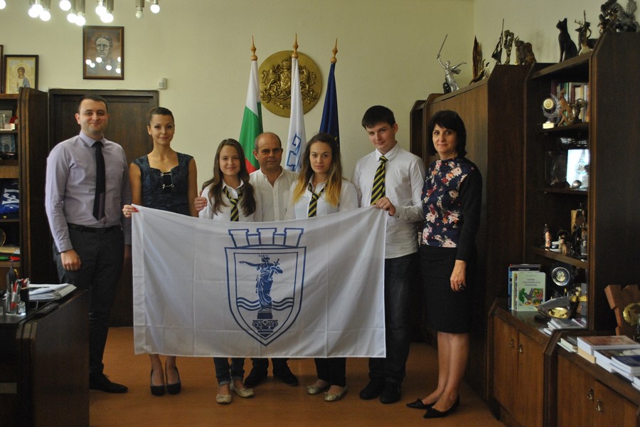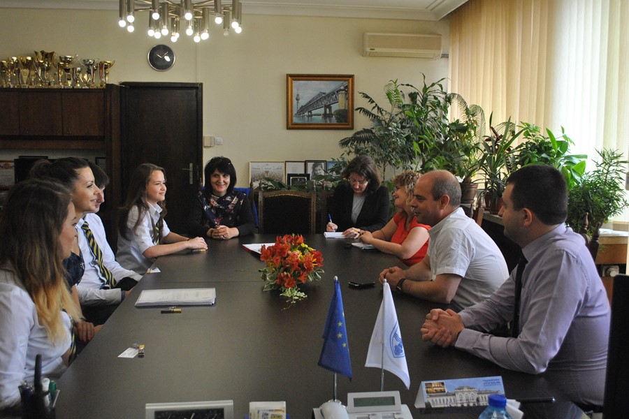 Александра Пенчева, Камелия Ангелова и Ангел Месарабов, гостуваха на кмета заедно с ръководителя си Теодора Станкова, преподавател по английски език и директора на русенското СОУ за Европейски езици Добромира Николова.