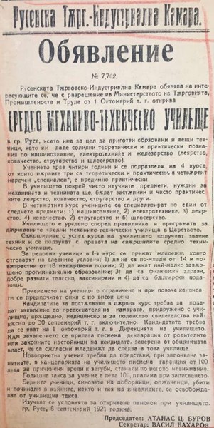 В деня 23 октомври 1921 година град Русе поставя началото на професионалното техническо образование в Североизточна България. Механо-техническото училище отваря врати по инициатива на видния русенски банкер Атанас Буров и Русенската търговско-индустриална камара, превръщайки се в третото подобно учебно заведение в страната.