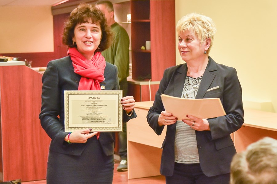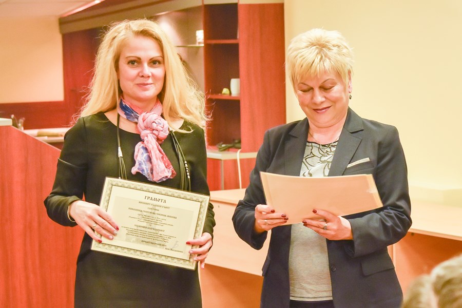 Отличените магистрати получиха персонални грамоти заради участието си в Образователната програма „Съдебната власт – информиран избор и гражданско доверие. Отворени съдилища и прокуратури“ и проявения висок професионализъм и компетентност при реализирането й.