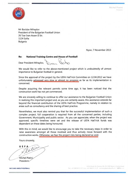 Този важен за българския футбол проект се забатачва така, че през 2013 г. председателят на УЕФА Мишел Платини предупреждава Михайлов с писмо, че финансирането може да бъде изгубено.