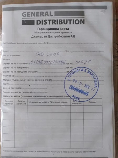 Обявата върви със снимки на генератора, на една от които е и фактурата за машината, от която се вижда, че е купена от магазин „Практикер“ - Русе на 6 ноември 2022 година. Може да видите самата обява - https://www.olx.ua - Генератор DAEWOO.