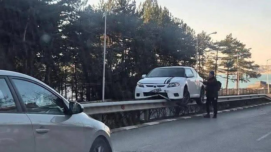 Инцидентът се размина без пострадали, но предизвика сериозен интерес сред преминаващите шофьори заради необичайната позиция, в която колата остана върху металното съоръжение.