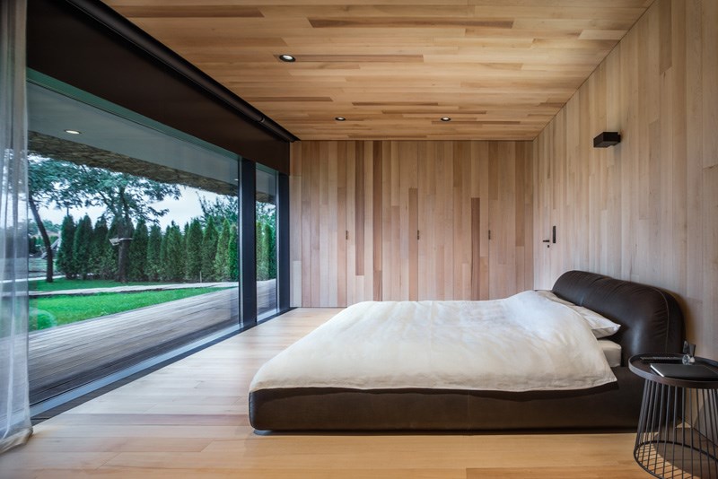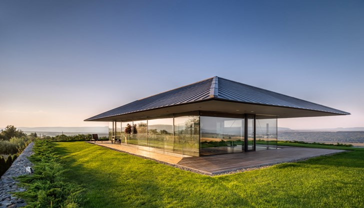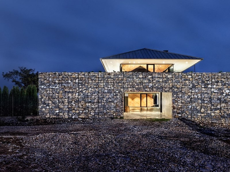 Проектът носи името Observation House съвсем уместно – сградата се намира на върха на хълм, от който се открива гледка към околните ниви и ливади. Фактът, че около нея няма близки сгради обяснява и избора на стъкло за голяма част от фасадата й. Друга пък е изцяло от габиони, с което напълно ни спечели.