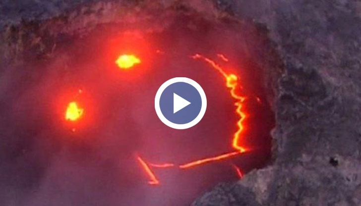 Видео показва кадри, на които се вижда как пукнатините в скалата, от които се излива лава, образуват нещо като лице с две очи и малко назъбена усмивка.