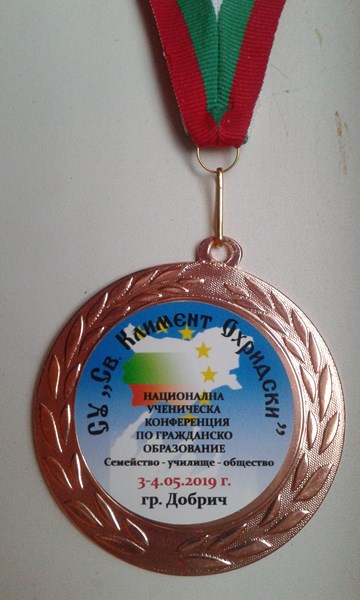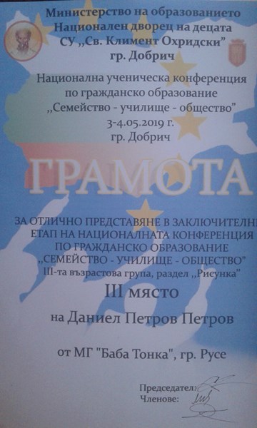 Даниел Петров от XI „а” клас на МГ "Баба Тонка" - Русе се завърна с бронзов медал от V Национална ученическа конференция по гражданско образование "Семейство, училище, общество".