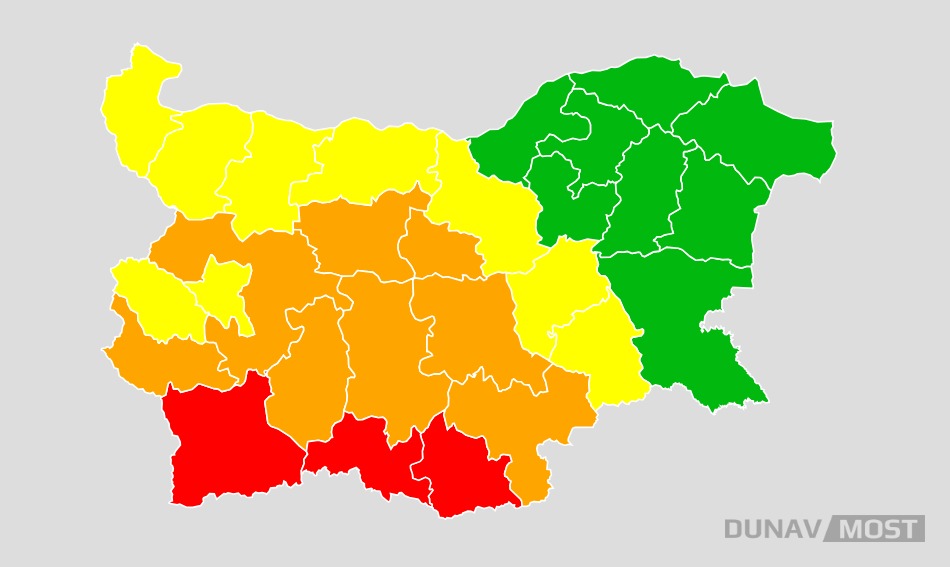Червен код (Най-висока степен на опасност) Предупреждението е в сила за най-южните планински масиви. Очаква се количествата дъжд да достигнат екстремни стойности в областите: Благоевград, Смолян и Кърджали.