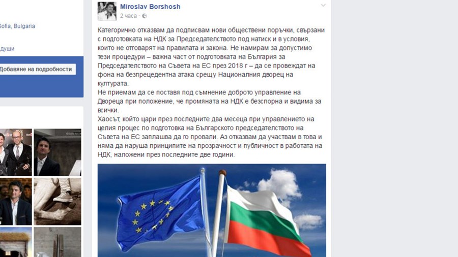 "Категорично отказвам да подписвам нови обществени поръчки, свързани с подготовката на НДК за Председателството под натиск и в условия, които не отговарят на правилата и закона. Не намирам за допустимо тези процедури – важна част от подготовката на България за Председателството на Съвета на ЕС през 2018 г – да се провеждат на фона на безпрецедентна атака срещу Националния дворец на културата.