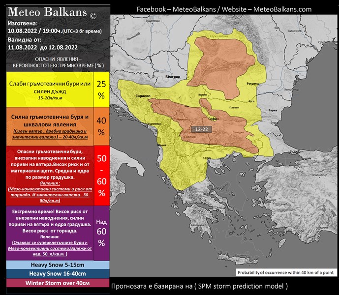Оранжев код: Валежите на отделни места над посочените райони ще са значителни, предимно в късните следобедни часове. Те ще са придружени от силни пориви на вятъра и засилена гръмотевична дейност. Бурите могат да носят дребна и средна по размер градушка. На отделни райони в страната и на Балканите очакваните валежи могат да достигнат до 25-40 л/кв.м.